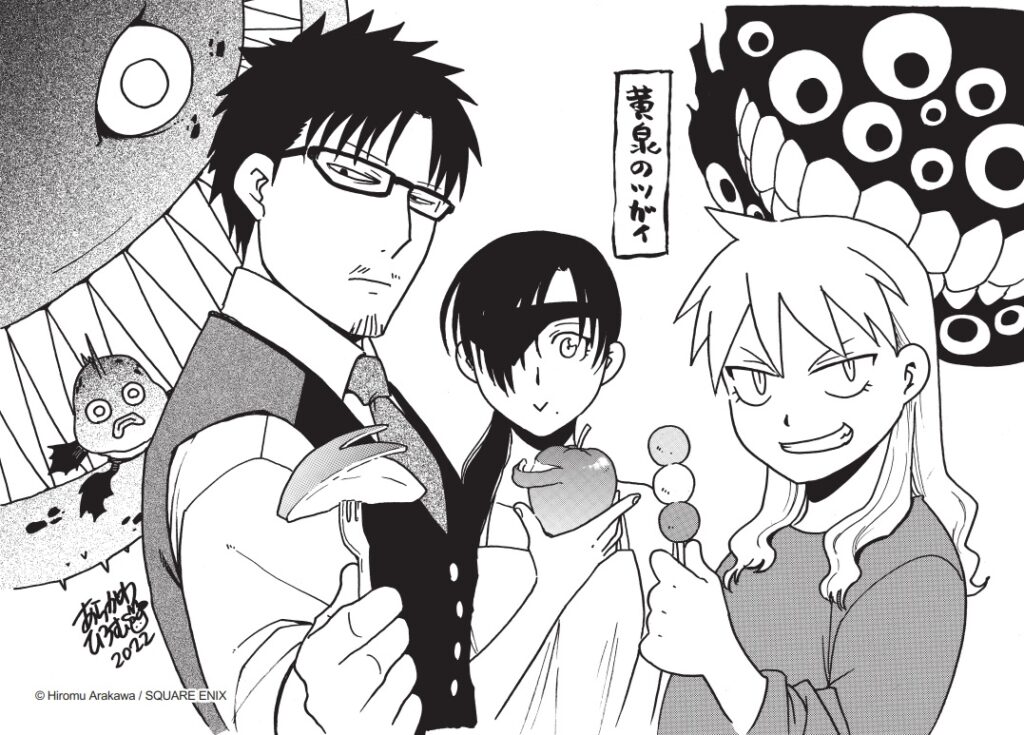 《黃泉雙使》(日語:黄泉のツガイ)是《鋼之鍊金術師》作者荒川弘的最新漫畫作品,2022年起於《月刊少年GANGAN》連載。故事以雙胞胎兄妹與神秘「雙使」的戰鬥為主軸,融合奇幻、懸疑與動作元素。本作品在日本獲得高度期待,曾獲「全國書店店員推薦漫畫2023」第2位,並入圍「電子漫畫大賞2024」男性部門。動畫版由安藤真裕導演、高木登劇本統籌、末廣健一郎配樂,陣容豪華,被視為荒川弘繼《鋼之鍊金術師》後的重磅新作。